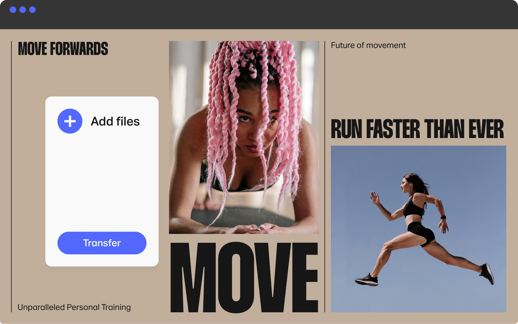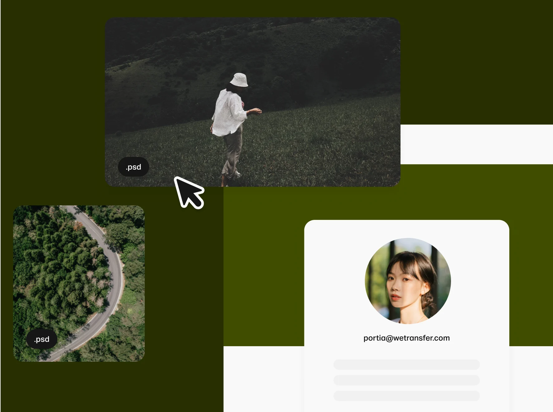 Make WeTransfer your own and stand out online with custom backgrounds, URLs, beautifully personalized emails, social links, and so much more.